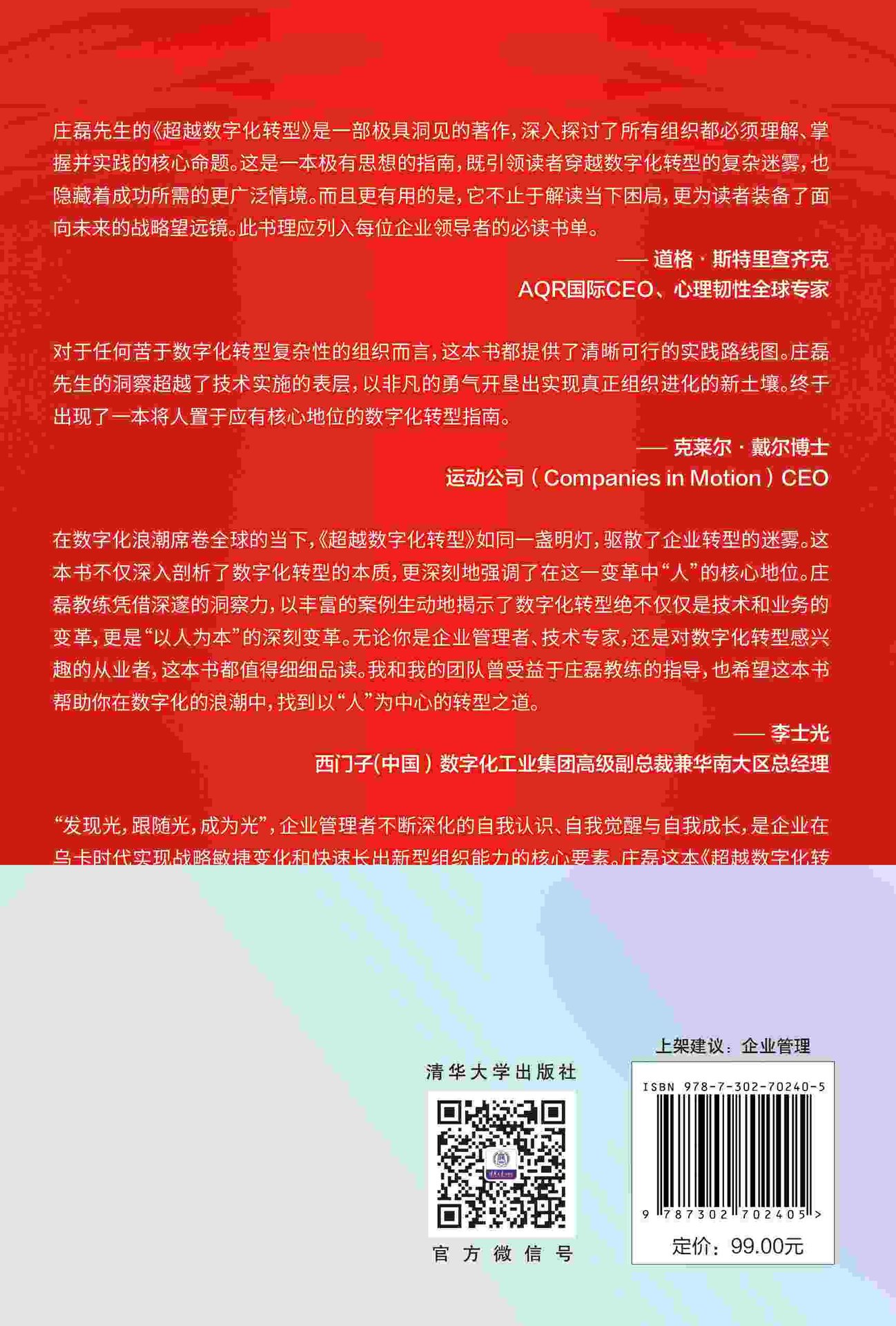 "在科技飛速疊代的當下,數字化與AI轉型已成為企業戰略核心,其成功率卻不足兩成。實踐證明,轉型的真正引擎並非技術或業務本身,而是人——尤其是領導者的轉型。唯有培育具備創新力與生態思維的數字化轉型領導者,才能激發組織突破技術與業務邊界的未來競爭力,實現個體、業務、組織與生態的可持續發展。 《**數字化轉型》一書直擊AI時代數字化轉型的本質,創新性提出“三位一體”進化模型:以數字化技術、業務模式、組織架構的協同聯動,驅動企業完成系統化轉型。同時明確,作為轉型的核心推動者,領導者需率先在認知、情感、行為層面實現心智躍遷,方能成長為高效的數字化轉型引領者。 書中不僅系統梳理了數字化轉型的核心理論、實用工具與落地思路,更深度剖析了華為、美的、西門子等知名企業在不同領導者的帶領下,應對轉型挑戰、突破自我推動轉型、實現從優秀到卓越跨越的實踐案例。讀者既能通過這些案例理解數字化轉型的全景邏輯、拓展視野、提升認知,更能獲取可直接應用的方法與思路,為自身企業的轉型之路註入強勁動力。"